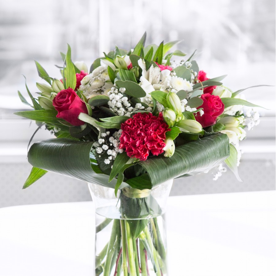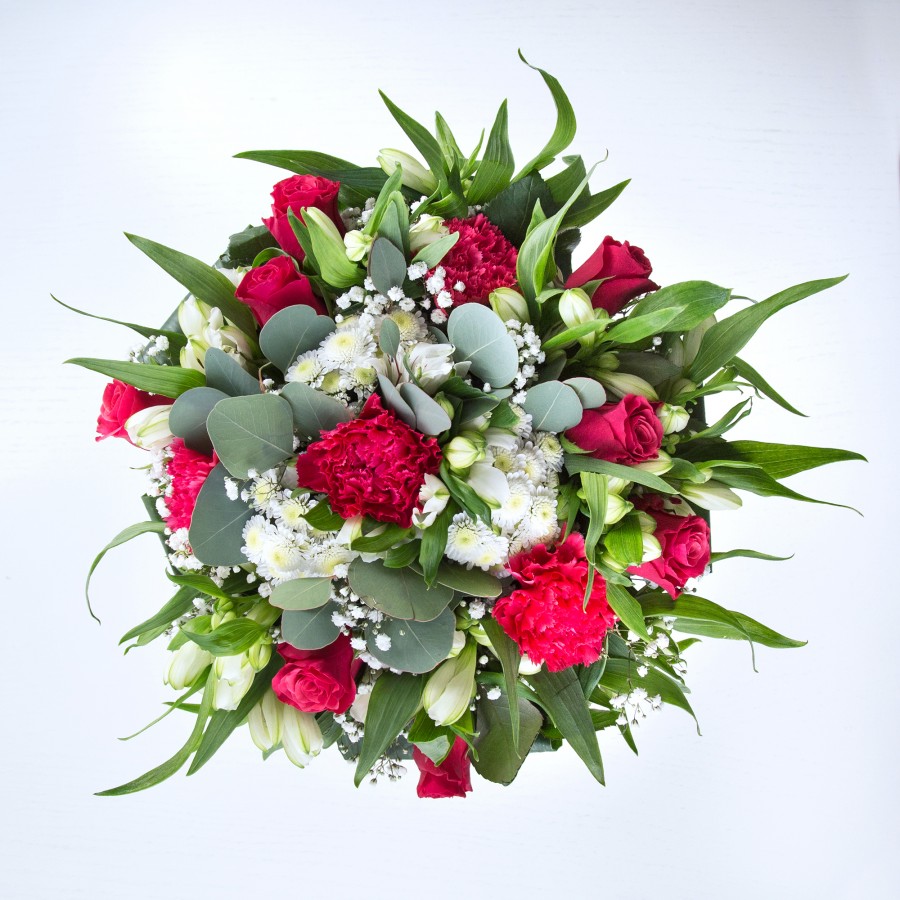 Embrace the timeless beauty of our Timeless Beauty Bouquet. This exquisite arrangement highlights rich red roses, sweet white chrysanthemums, and delicate gypsophila, perfectly paired with white alstroemeria and lush aspidistra leaves. Each flower is hand-selected to ensure superior freshness and quality.